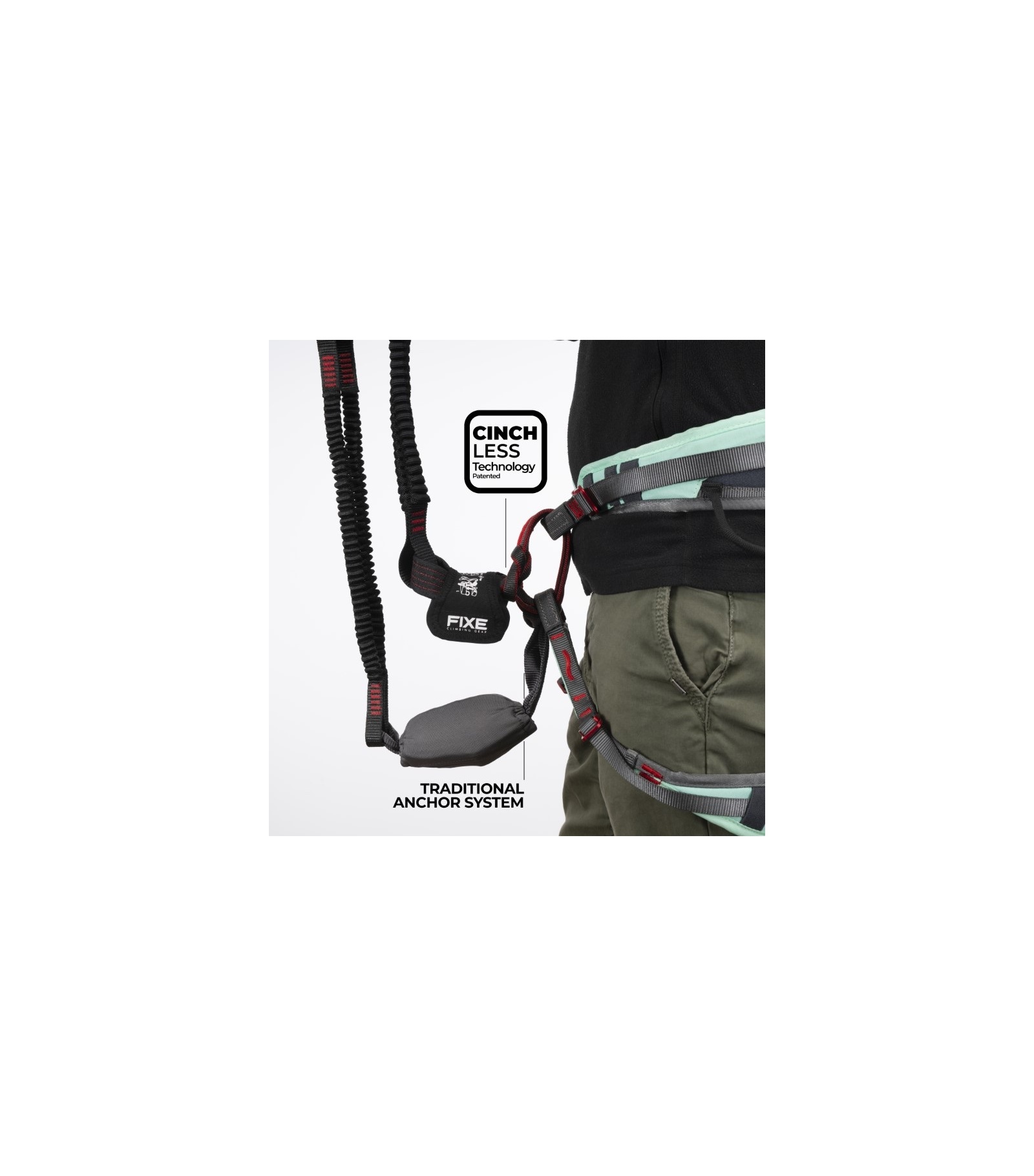 El Ferratum Cinchless de Fixe supone un salto evolutivo en la protección para vías ferrata. Gracias a su sistema Cinchless patentado, la unión al arnés se realiza directamente a los puntos de encordamiento (cintura y perneras), evitando la compresión del anillo ventral. Esto reduce significativamente el efecto péndulo, mejora el confort en caso de caída y deja el anillo ventral libre para conectar otros dispositivos como una cinta de posicionamiento.