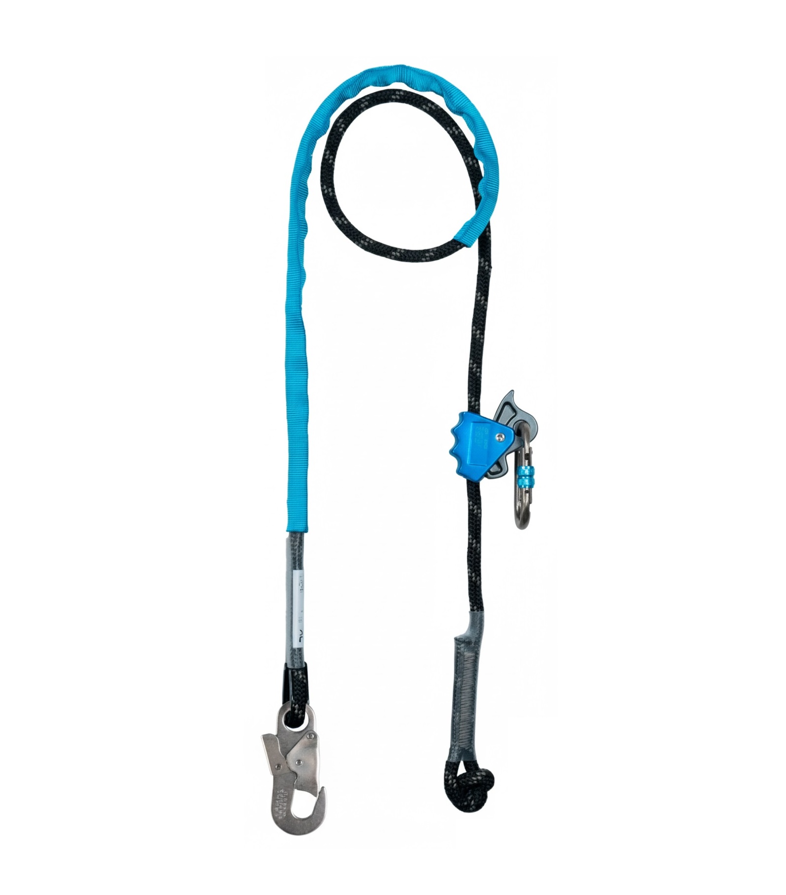 Su longitud regulable hasta 2 metros permite adaptar la distancia de trabajo a cada situación, ofreciendo libertad de movimiento sin comprometer la seguridad. Los conectores de 18 mm de abertura facilitan el enganche con distintos equipos de protección individual, mientras que el protector de cuerda incluido prolonga la vida útil del conjunto, evitando el desgaste por rozamiento.