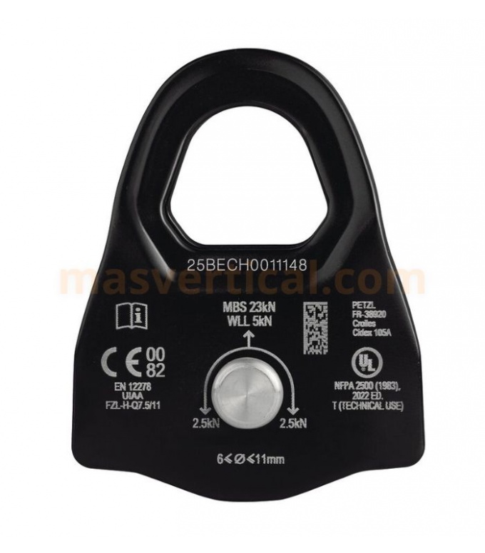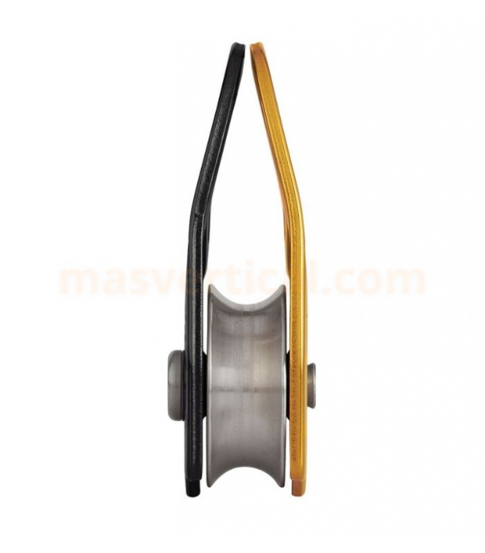 La roldana monta un rodamiento de bolas estanco que proporciona un rendimiento muy elevado en las maniobras de izado y retención, reduciendo al mínimo la fricción. Los orificios de conexión permiten usar hasta dos mosquetones y están dimensionados para que pueda voltearse la mayoría de mosquetones que cumplen las normas europeas, aportando versatilidad en el montaje de sistemas de trabajo y rescate en altura.