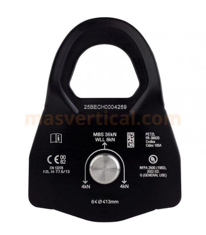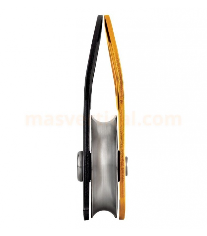 Equipada con una roldana de gran diámetro montada sobre un rodamiento de bolas estanco, ofrece un rendimiento muy elevado del 97%, ideal para sistemas de izado y polipastos donde cada punto de fricción cuenta. Los amplios orificios de conexión admiten hasta tres mosquetones, facilitando montajes complejos y versátiles en rescate técnico, mientras que la construcción en aluminio y acero inoxidable garantiza durabilidad en un uso intensivo.